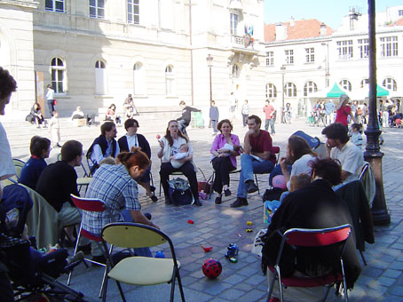 | En fin d'après-midi, un atelier pour les pères a été animé, sur le parvis, par Jean-Claude Verduyckt, père et sage-femme indépendant près de Charleroi (Belgique) <http://users.swing.be/carrefour.naissance/>. |